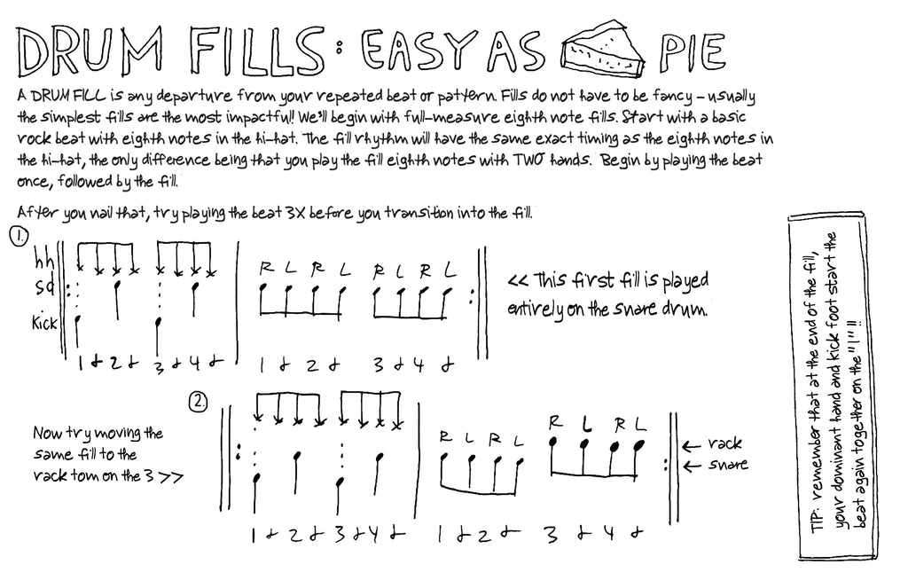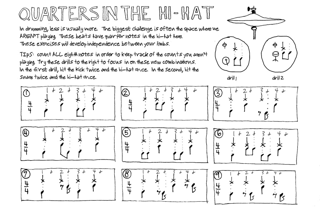 The DIY Guide to Drums is a non-intimidating & playful illustrated instruction Ebook for the drum kit. Beginners will find it's detailed explanations helpful, and intermediate players who want to improve their technique and form, learn new styles, or practice reading will also find it immensely useful.