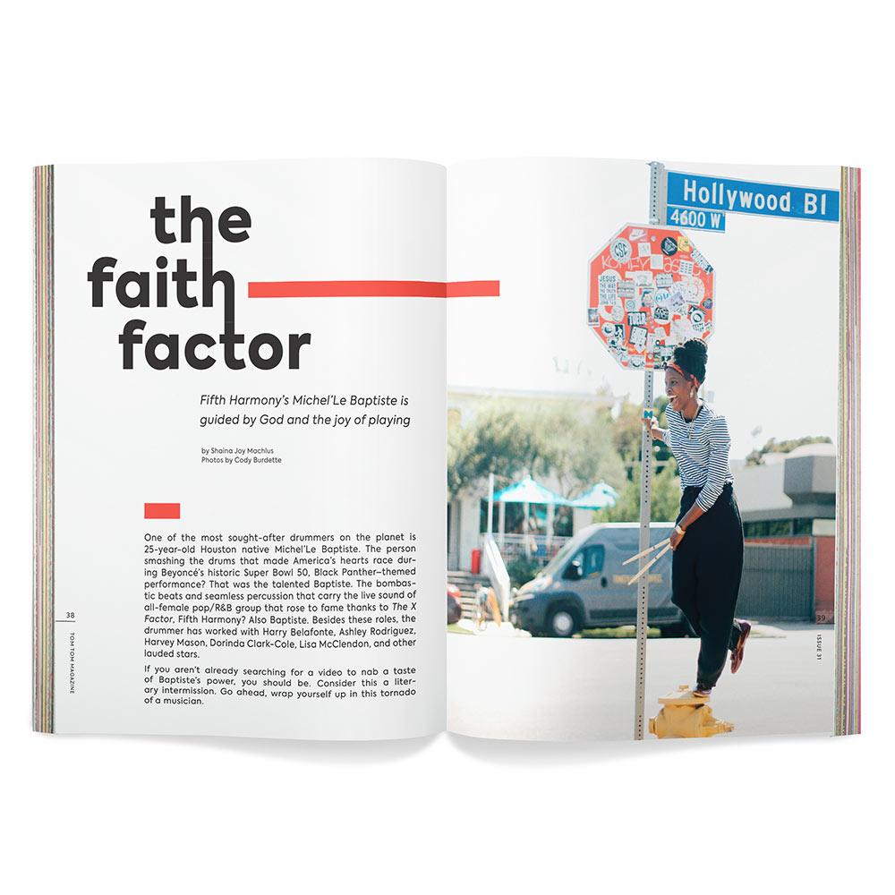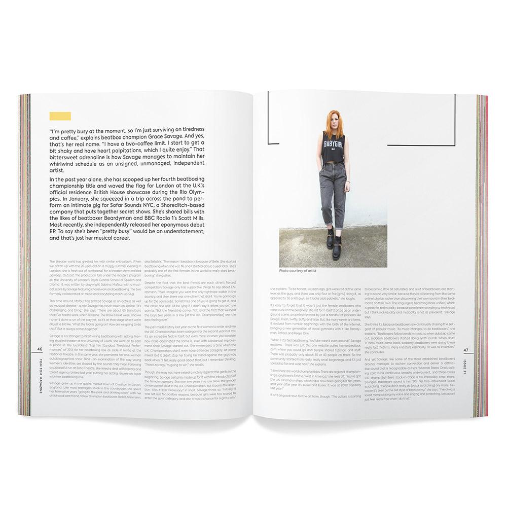 Tom Tom's Outlaw issue strays from the norm. Themeless, it explores artists whose stories didn't fit into past issues but who are worship-worthy all the same. We spoke with socially responsible Navajo punks Nizhóní Girls, hypercool Valentina Magaletti of Vanishing Twin, and Miami's scene-changing techno duo Roseasia. We talked to Fifth Harmony's Michel'le Baptiste (on the cover) about her faith, British beatboxer Grace Savage about working in theater, Rosalía about flamenco, and learned about Voices of Our City Choir which brings activists and the homeless together in song.