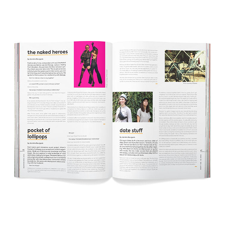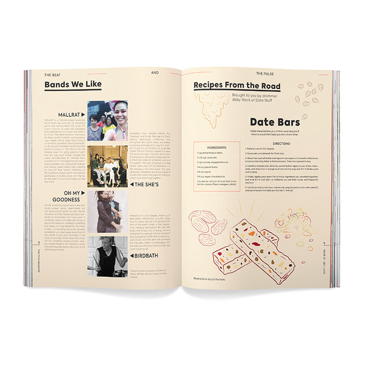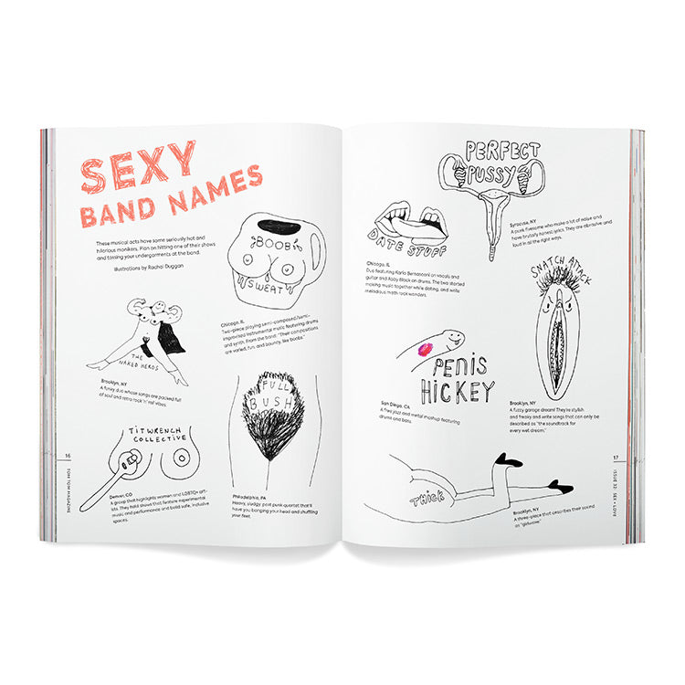 In this issue, Tom Tom offers accurate, unbiased, and non-fetishised accounts of sex and love by female musicians. The Sex and Love issue lets women describe and illustrate their own sensual journeys. We spoke with couples who make music together about creating and cohabiting with their romantic partners. We explored the experiences of Wax Idols's singer who is also a dominatrix and trans female experimental artist Sarah Hennies. We talked about what's in a name with Mannequin Pussy and Thunderpussy and included a sneak preview of a Spanish language, illustrated Consent Guide. There are even suggestions on how to foster self-love with yogi and former Avenue D singer Debbie Attias, a guide on the best sex toys for tour, and instructions for a meditative sound walk by environmental designer Mileece.